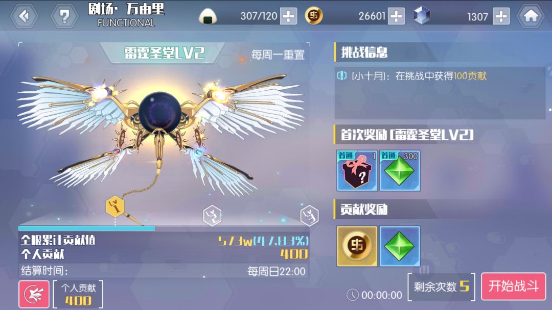 只需要打到100万伤害即可停手,打多了一点用没有,贡献上限为100,达到了建议把手机放一边等着,或者送死。每周打到一定贡献有奖励,记得领取。