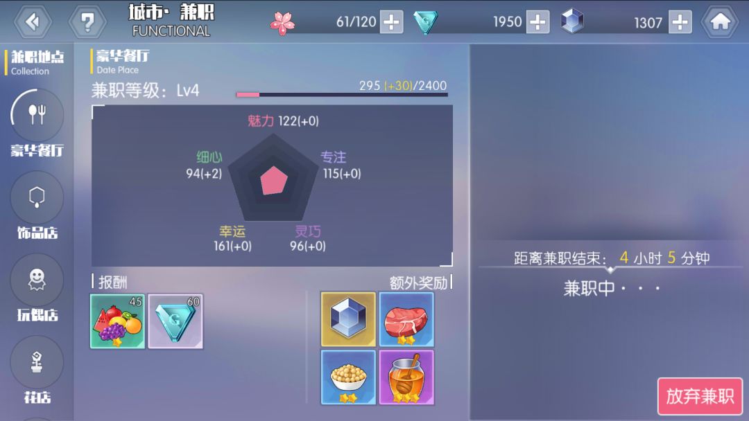 看图,没选择一个兼职时,对应在左边的谱图上回显示这个兼职到底加不加属性,加什么属性。随意如果你属性很低,很可能是忽略了这个,导致一直在胡乱兼职,导致属性很低。五个属性中四个和道具制作有关,而幸运的作用体现在,增加兼职获得钻石以及高级材料的几率数量。