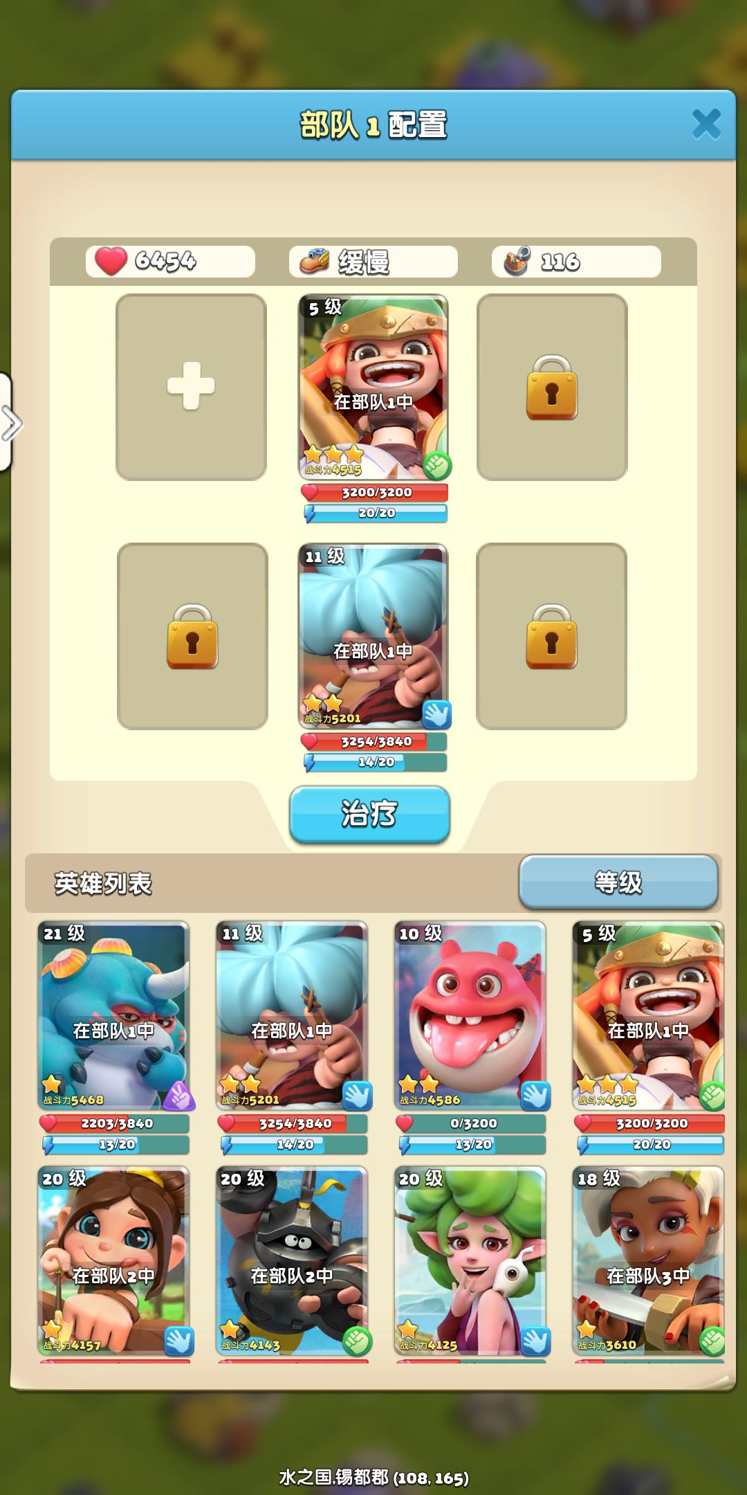 三级大本营时可以上三个英雄,推荐使用虎虎妞、盲童、喵龙(有首充的话喵龙换成神奇女侠);