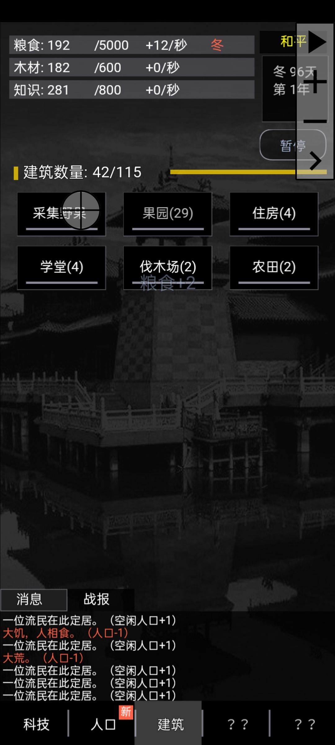 第二次进去带了上一局的一个陈宫(我觉着各个颜色的将除了血量有点差距,兵种攻击差距不大啊,而且到了后期其实武将自带那点血占比也不大了。6级酒馆有机会出金将了,攻击在98-100左右吧,但是等酒馆6级的时候我陈宫也有92攻击了呀,刚刷出的紫将才80好几的攻击)。开了连点器点野果,相当于+9/秒采集粮食,迅速弄两人砍木头^O^,升科技出五行年,每年按金木水土对应调整负责金矿、木头、知识、粮食的人数。