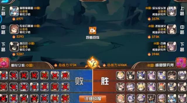 再说朝花夕拾与咸鱼研究所之间的战斗,双方赛前不谋而合,皆打算放弃此次晋级机会。咸鱼研究所仅仅是随心所欲的布了个阵,岂料朝花夕拾更胜一筹,为了输的更保险直接整体173K,可谓一浪更比一浪高,一水更比一水水。最终不出意外的,朝花夕拾成员收获此次鸡腿与200体力,剩闲鱼研究所成员陪了体力又失鸡,空留叹息。