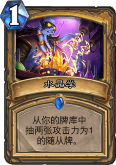 水晶学:这里水晶学是前期很棒的一张法术,它能帮助我们过滤1攻的随从,对于减少牌库后期鬼抽1费有很大的帮助。也可以在前期摸到快速找一些站场随从。这张卡一般情况下都是起手就留的。