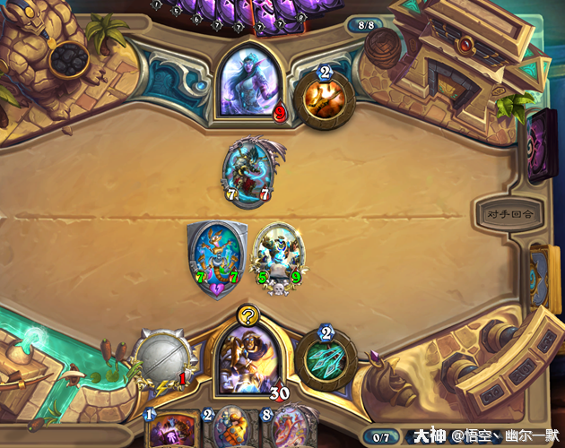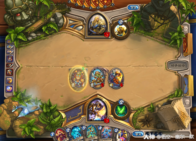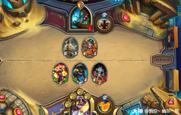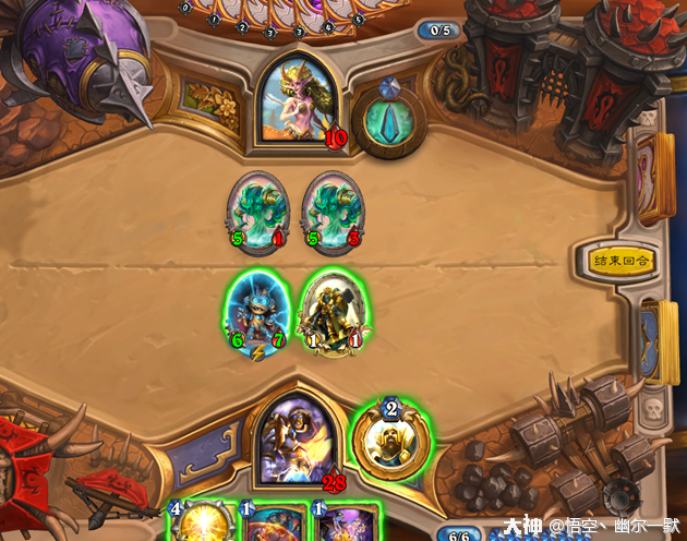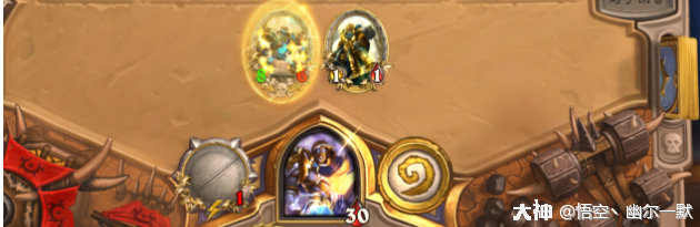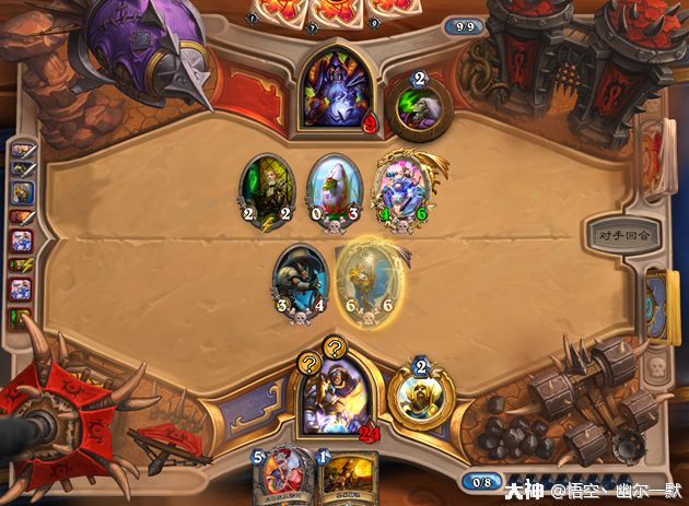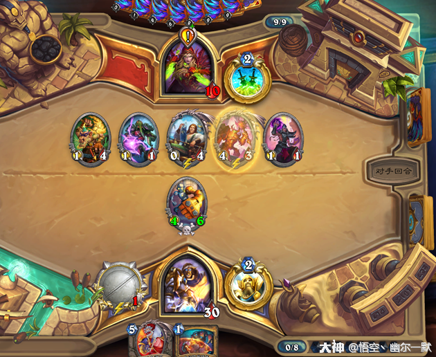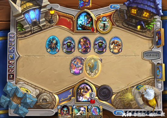 这个对局一直和对面解场拖就好了,后期如图,质量随从上去鱼人萨没有质量跟上的。前期如果能变技能就去找能打2的,这样配合解掉招潮等2血随从前期会比较轻松。(当然我们自己也需要多铺场和对面交换)中后期奉献、姐夫很关键,可以帮助我们清理大多数的场面问题。