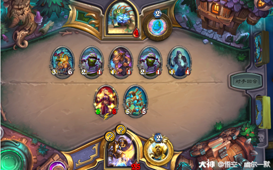 任务萨的解场能力其实并不强,对手前期基本还是围绕做任务去下随从,这些随从的解场能力都很差,主要是依靠跟班的突袭,和战吼打2来解场的。这个对局我们前期主要养奥秘守护者,再配合一些机械去抢血即可。注意防130,在保住重要随从的情况下多走脸。