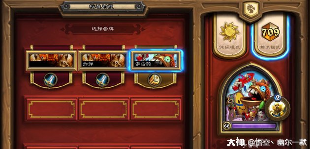 这次小幽开了小号和大号分别打了两个分段,在传说1000左右的分段感觉胜率还可以,往往能给对手意想不到的惊喜,因为大多数对手还是默认当鱼人骑来打的。小号从7级打到了3级,除了任务萨会比较难打之外,胜率达到了65%以上。