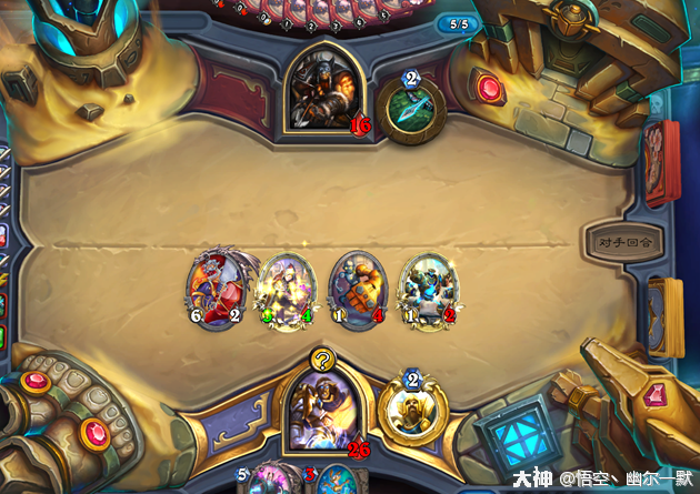 打宇宙猎就要比他更快的抢血,起手利用奥秘守护者和一些机械随从进行铺场在防住奥秘的同时不停给对手场面压力就好,宇宙猎解场能力很差。如图,测试冰冻陷阱可以用低费随从,我们在没什么手牌的情况下火车王甚至可以直接上,再用1攻的小随从去解龙,对面未必能在第一时间解掉火车王。我们多用随从配合奥秘去消耗,武器多走脸就能赢。