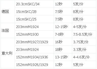 可以看到,除了美国海军的几种机关炮属于特殊情况之外,其余国家的6英寸火炮射速,基本都在8英寸火炮的1.5倍左右,日本的15.5cm火炮射速甚至不比20.3cm火炮快多少。6英寸火炮的射速优势是存在的,但却没有威力上的差距那么大,且由于实战中通常都发挥不出最大射速,因而6英寸火炮在射速的优势并不像8英寸火炮在威力上的优势那样容易发挥出来。