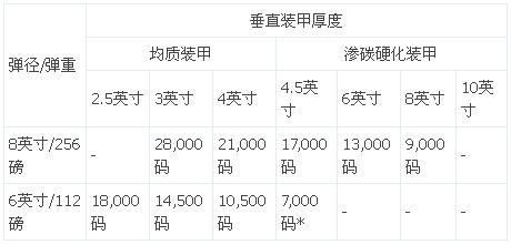 备注:1、数值旁标有星号的情况,指的是尽管在该距离上炮弹预计能够穿透装甲,但无法有效起爆,只能造成轻微破坏。2、表格中左上角部分的横杠,指的是炮弹能够在任意距离上穿透此等厚度的装甲。3、表格中右下角部分的横杠,指的是炮弹在任何条件下都无法穿透此等厚度的装甲。