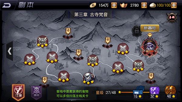 继续推图。通关完2-5,心法开启,把心法升到不能升为止,此后心法等级跟着人物等级走。通关至2-9,接下来打2-10,会有点困难。加快提升实力吧。暗器打磨、客栈扫荡升级,装备洗练通通跟上。战力达到推荐值之后,进去2-10跟boss干一架吧!
