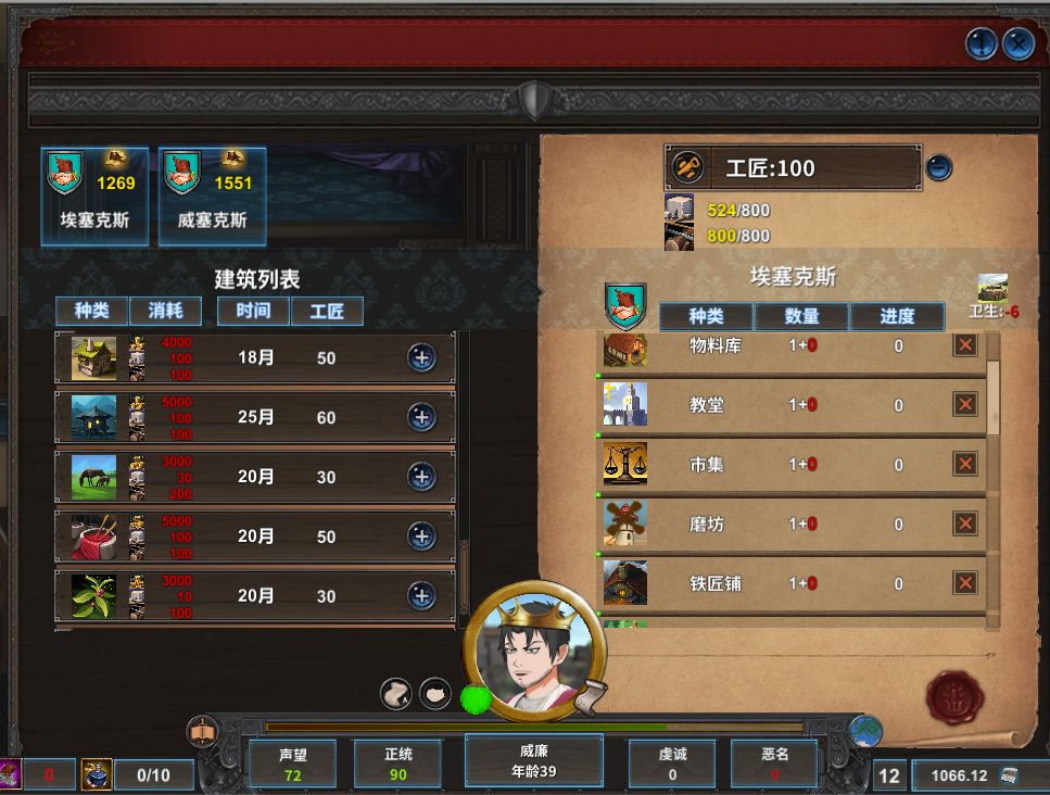 目前建筑种类20+,除了卫生建筑外,每一个建筑都会增加封地的卫生惩罚,有的多有的少。当卫生为负值时,将极大几率导致领地爆发疾病。 墓地在爆发疾病时可以有一定几率阻止疾病周期的延长。