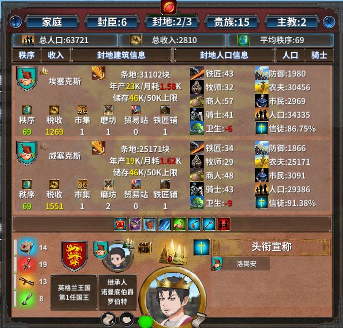 领地人口也会根据领地的坏境进行转换定居,除了农奴外,自由农,无地农,市民都可以移动到相邻的领地进行定居。无地农有一定几率饿死或转移到其他领地,他们会根据封地是否有疾病和空余的条地决定移动到相邻领地。而自由农和市民则会根据领地的秩序,卫生,疾病决定移动到相邻领地,自由农还有一定几率会转换为市民。