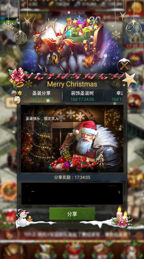 【活动内容】:在活动开启后,领主大人可以将圣诞节的喜悦分享给其他人,成功分享将获得大量奖励。