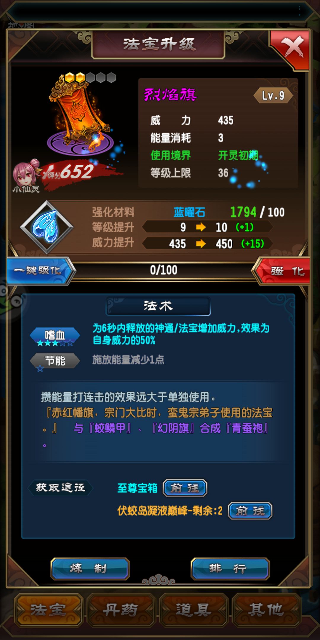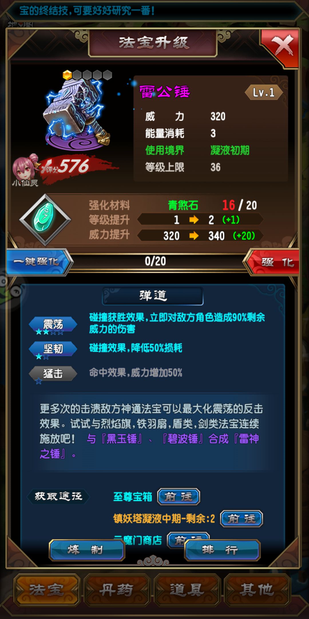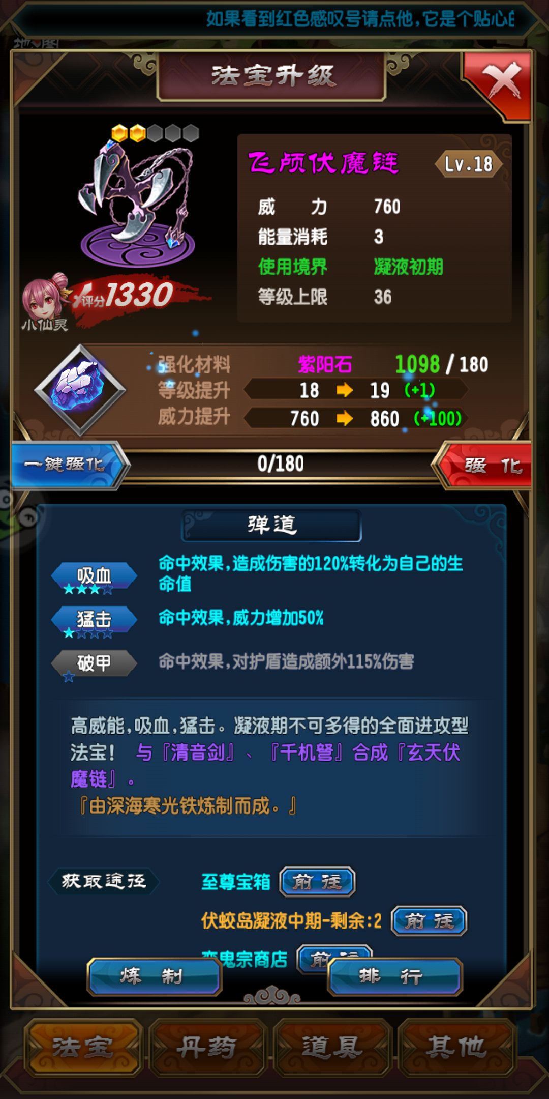 注:法宝没有做全(白虹巨剑、巨龟、白骨巨锤各碎片150)切记不要升化晶凝液总结一下: 宗门 功法 刷法宝碎片 幻宫 这四个核心做好,基本上凝液这一层根基也算做稳了,万丈高楼平地起,修仙也是如此,吃得苦中苦,方为人上人,凝液篇完。