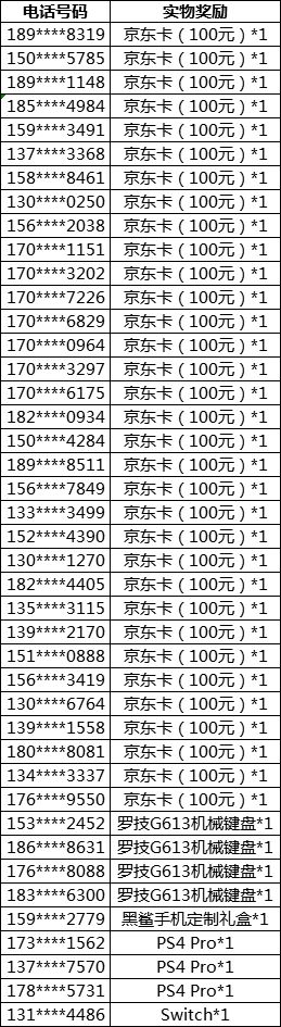 2月27日到3月4日,我们又抽出了33张100元京东卡,4台机械键盘,1台NS、三台PS4 PRO以及一台黑鲨手机!恭喜下面这些好运爆棚的船长,就等着我们工作人员的电话吧!