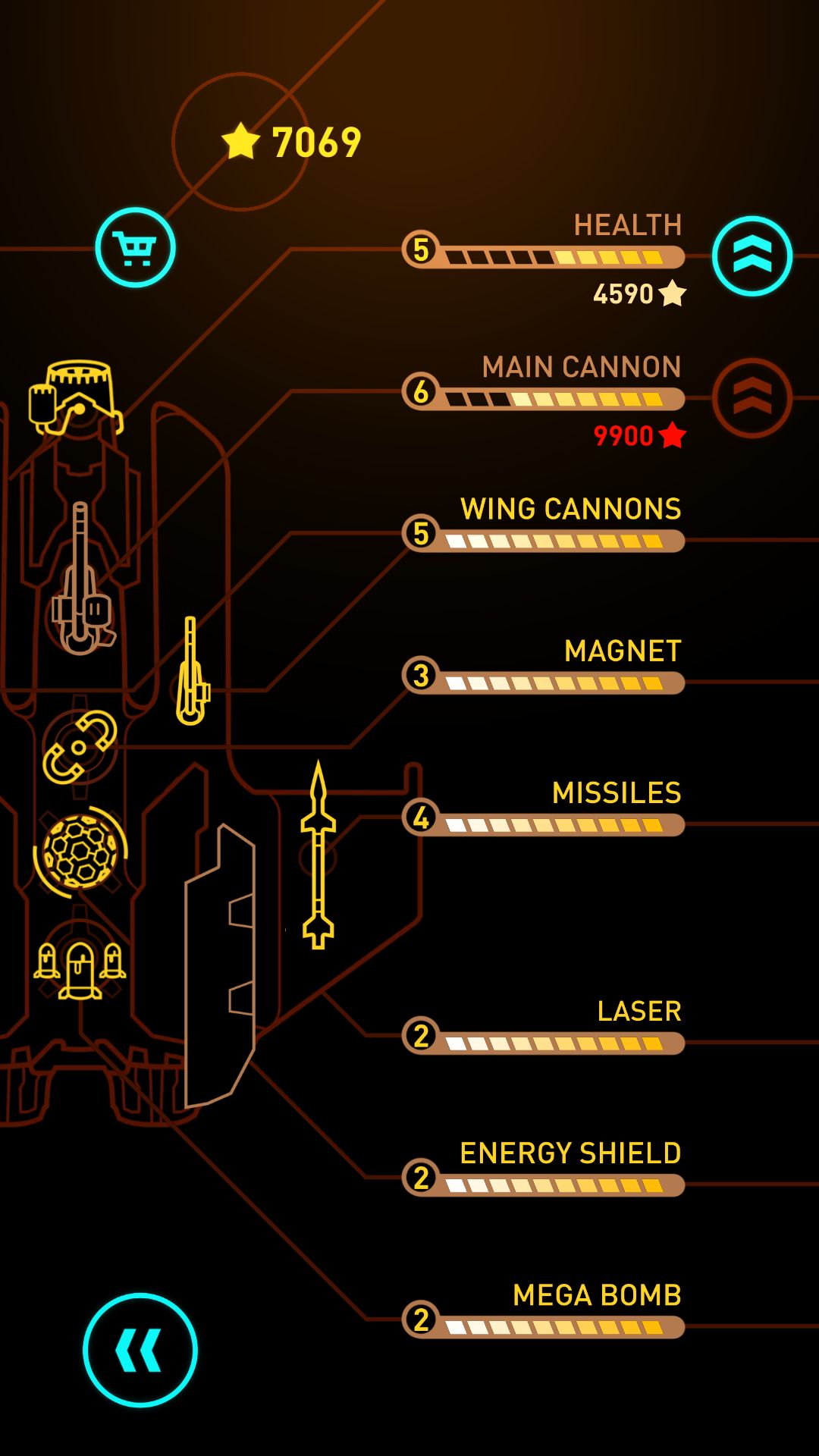 首先是升级武器,个人建议优先升级翼炮,翼炮过量伤害可穿透目标,打小飞机可以一打多,然后是导弹,别看导弹只有两枚,但是伤害很足,特别是你解锁了最后一个导弹分裂飞机之后,导弹数量达到16枚,各种补刀不在话下,激光,护盾,核弹建议滞后升级,因为提升不大,我都是最后才升的,如果相信自己的技术的话,血量可以最后升级,毕竟每关都有无伤目标。