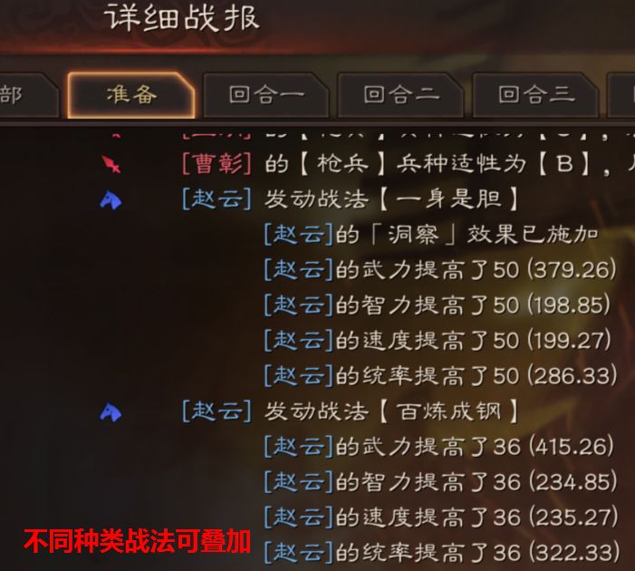 属性状态是影响武将实力的基础关键,在战斗时不同种类的战法带来的效果可以叠加,同一个战法带来的效果则会刷新持续回合。