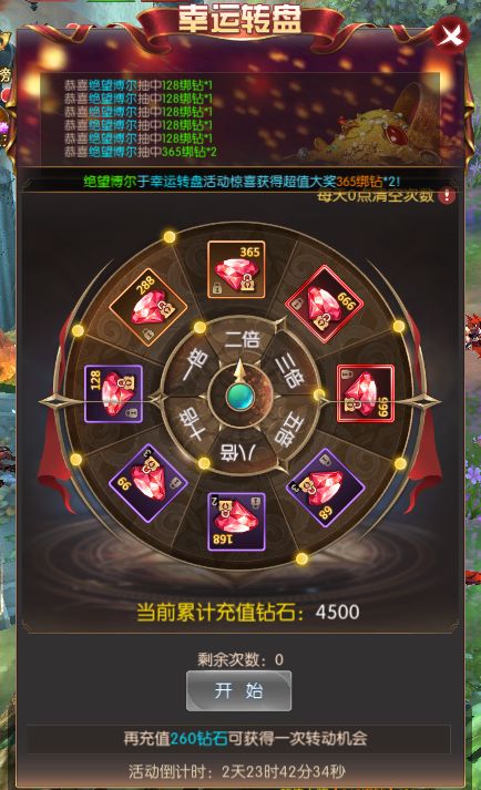 活动规则:活动期间,累计充值钻石便可获得相应的幸运转盘次数