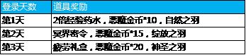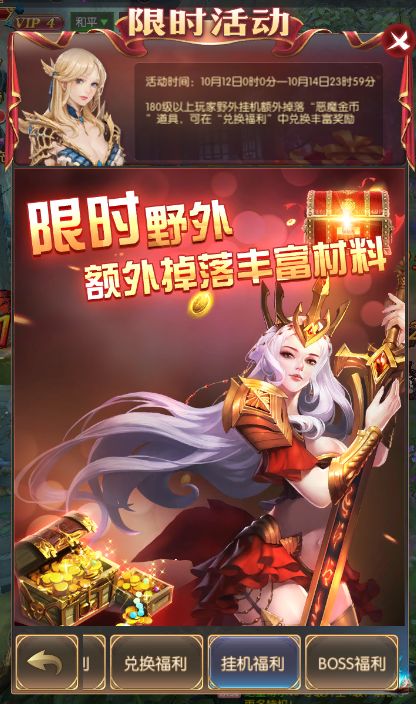 活动规则:活动期间内,180级以上玩家野外挂机额外掉落 “恶魔金币”道具,可在“兑换福利”中兑换丰富奖励