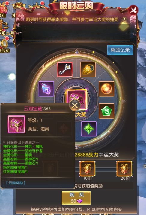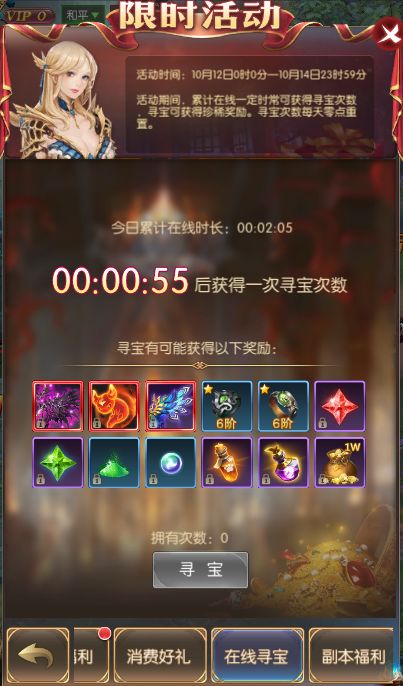 活动规则:活动时间内累计在线一定时长可获得寻宝次数,寻宝可获得珍稀奖励。寻宝次数每天零点重置。