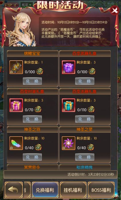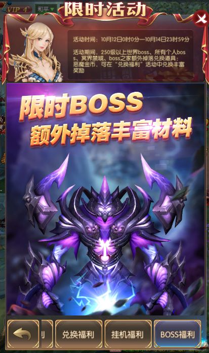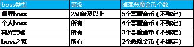 活动规则:活动期间,250级以上世界BOSS、所有个人BOSS、冥界禁域、boss之家额外掉落兑换道具:恶魔金币,可在“兑换福利”活动中兑换丰富奖励