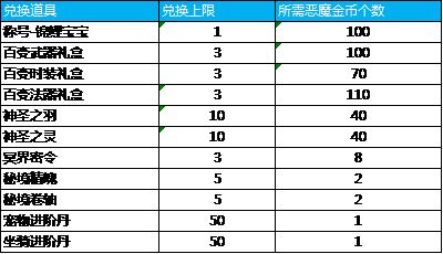 活动规则:活动期间内,活动产出的“恶魔金币”,可在此活动中兑换丰富奖励。(“恶魔金币”产出活动结束后,此兑换额外开放一天,请抓紧时间兑换哦)