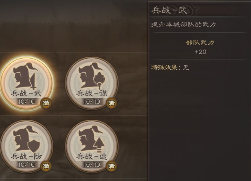优先级最高的几个建筑是“兵战-武、谋、防、速”,每次升级都能增加部队武将的属性,是前期最直接的提战方式,战法满级为10级,前期建议优先升到5-6级,消耗的资源比较少,而后根据自身情况可以进一步去提升等级。