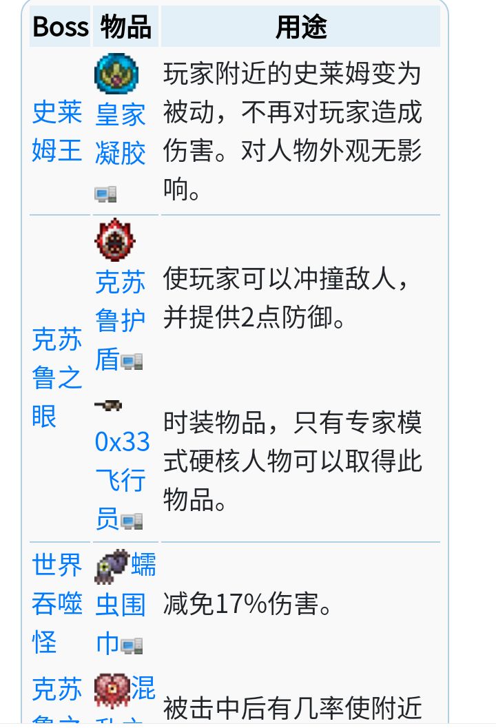 后继每名玩家都会比上一个带来更多生命值增加量:生命值增加量[n+1] = 生命值增加量[n] + (1 - 生命值增加量[n]) / 3 如果有十名或更多玩家,多人模式生命值提升会用如下公式加以修正:多人模式系数 = (多人模式系数 * 2 + 8) / 3 多人模式系数不能超过 1,000。实际上永远无法达到这个上限,因为这需要有 1,498 名玩家。 大多数 Boss 拥有新的攻击或移动方式,这让它们更加困难。例如,猪龙鱼公爵,有第三阶段了。 击败Boss(除了拜月教***徒、黑暗魔法师、和食人魔)后会得到此专属于此 Boss 的专家模式独有的宝藏袋。宝藏袋内有更多此 Boss 在普通模式下的常规掉落物品及一件独特的专家模式独有物品。这些物品全部可以在非专家模式世界中使用,除了恶魔之心。困难模式 Boss 的宝藏袋有 5% 几率额外包含一套开发者物品。无论在专家模式世界还是普通模式世界都可以打开宝藏袋。 物品与掉落 敌怪会掉落 2.5 倍量的钱币。 罐子被砸碎时会掉落更多物品。 钓鱼任务奖励更多金钱。 放置敌怪旗后,其提供的增益更加强力。 世界中能找到武装僵尸雕像与骨头骷髅雕像。 困难模式地牢敌怪有 50% 几率掉落 2 个物品。 玩家 没有吃得好增益时生命再生速度减半(若有闪亮石则只减四分之一)。 吸血鬼刀与幽灵盔甲的治疗效果略微降低。 防御属性更加有效,比普通模式效率高 50%。[1] 在雪原生物群落中接触到水时会受到冷冻减益,此减益在水中则全程保持,出水后再持续 5 秒之后消失。 中毒、黑暗、被诅咒、着火了!、流血、困惑、缓慢、软弱、寂静、破损盔甲、诅咒地狱、霜冻、冷冻、冰冻、灵液、毒液、灯火管制等减益持续时间翻倍。 使用专家模式独有物品恶魔之心可以获得第六个配饰栏。但这个栏位仅当玩家处于专家模式世界中时才起作用。 专家模式独有物品 对于分类页面,参见。 专家模式独有物品通过打开 Boss 掉落的宝藏袋得到,其稀有度均为“彩虹”。 这些物品只能从专家模式的世界中得到,但它们在普通世界中也依然可以正常使用,除了恶魔之心。