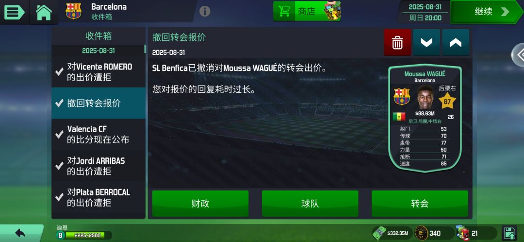 很多报价都没收到,没提示也没有显示,到了时间直接被拒绝,真的难受。年轻球员出租的合同也是,好多都自动拒绝了,这样不好啊