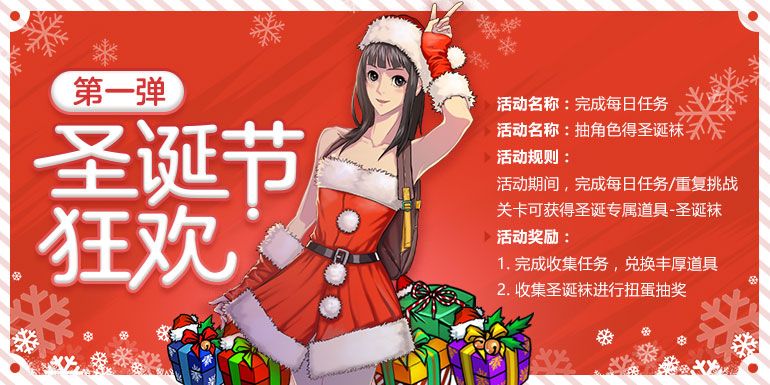 活动规则:活动期间,完成每日任务/重复挑战关卡可获得圣诞专属道具-圣诞袜