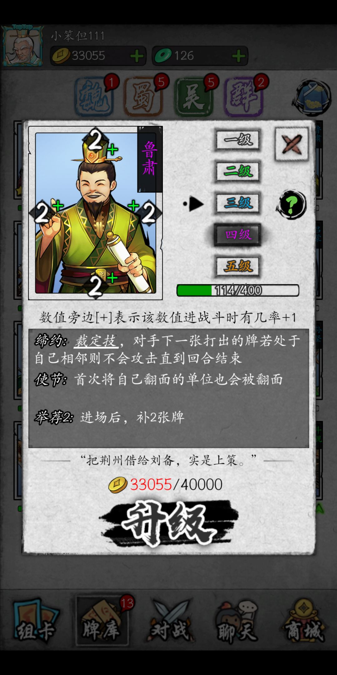 鲁肃:吴国起手牌之一,克制蜀国,3级后可以补牌。缺点,点数低不能清大部分工事。对魏国的话,不推荐起手放。最后两手放的话,有奇效。