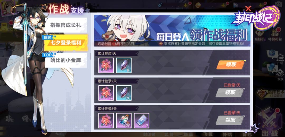 后勤娘已经设置了“七夕登录奖励”!在活动期间,每日登录游戏都可获得后勤娘给大家准备的七夕甜蜜小礼品,包括鲜花、钻石、爱心弓箭随机配饰宝箱等等!