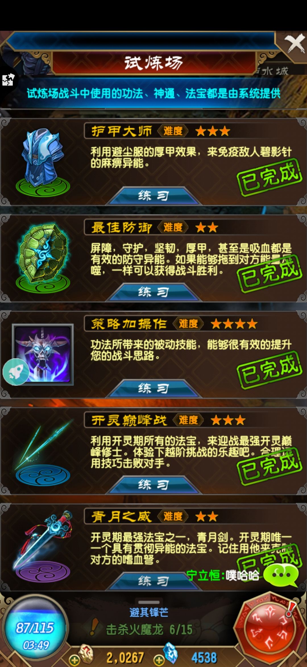 护甲大师 过关技巧:神通依次选择石弹术、元壁术、血煞鬼骨剑,3回合立刻使用避尘服,6回合第一时间将白骨锤放置在右边弹道,注意这场战斗拼的是手速,所以一定要快,否则任务条件无法达成。 这场战斗主要为让我们了解一些辅助类型法宝的使用,例如碧尘服可以在一段时间内免疫麻痹效果,而碧影针则可以在短时间内麻痹对手,使对手无法释放神通。这些类型法宝虽然威力上不怎么样,但却可以在战斗中起到出其不意的效果,例如在对手释放防御型神通前,先用碧影针晕住对手,再使用白骨锤紧跟其后,这样就能让白骨锤不受损耗的砸在对手脸上。 最佳防御  最佳防御 过关技巧:神通依次选择石弹术、元壁术、天阙尸衣,战斗中优选使用防御型法宝即可,对手使用白骨锤时,可用符剑抵挡。 我们在前期在快速冲级时,往往更注重的是如何提高自己的伤害能力,而忽略了对自身的保护。这一关的重点就是告诉我们,输出法宝固然重要,但也要兼备一些防御类的法宝,因为你不可能永远都压着对手打,有时防御是最好的进攻手段。 策略加操作  策略加操作 过关技巧:功法选择地灵功,神通依次选择石弹术、蛛丝术、风刃术,战斗开始后先攒能量,当能量达到6点时,立刻将三棱骨锥和白骨锤同时放入右边弹道。 这一关主要考验我们对细节的操作和策略,之所以将风刃放置在第三位有2个原因,首先风刃的神速和穿透效果可以帮助我们快速清场弹道上障碍,之后我们只要将输出能力高的法宝紧随其后,就能避免损耗实打实的砸在对手身上;其次将风刃放置在第三位,刚好是能量达到3、6、9这样的关键节点,这样我们不但能享受风刃的清场效果,同时还能第一时间丢出法宝。 开灵巅峰战  开灵巅峰战 过关技巧:神通依次选择荆雨术、天阙尸衣、血煞鬼骨剑,3能量时立刻将碧影针丢到中间弹道,6能量时第一时间将白骨锤放到左边弹道(丢白骨锤时,先让弹道上的石弹走完再丢。) 这一关综合考验了玩家对游戏战斗的操作,除了法宝、神通的选择之外,战斗中法宝使用的时机和搭配,弹道的选择等等都是值得我们细细揣摩的,一套合理的套路打法往往能够帮助我们以弱胜强。 清月之威  清月之威 过关技巧:对手会在6回合时连续使用烈焰旗和燕尾刃,这时我们只要相对应的将清月剑放在同一弹道(中)即可。