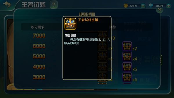 在王者试炼中殿下每关拥有99点点血量,根据关卡结束时的剩余血量结算积分,每周高积分发放SS碎片大宝箱,每关也有单独的通关宝箱发放,英雄碎片的主要产地。
