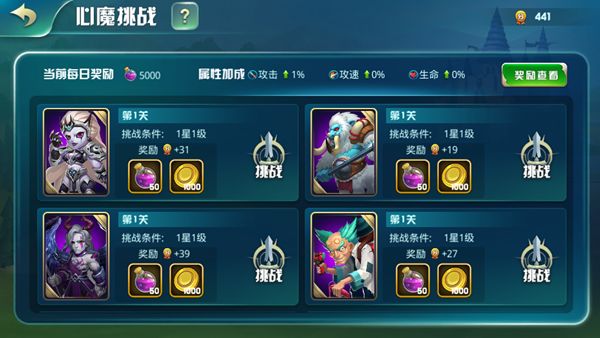 在心魔挑战中,殿下可以查看到能够挑战的英雄。达到挑战条件规定的等级和星级要求便可以挑战。挑战胜利后可以金币、英雄经验以及积分。当积分达到指定条件后可获得三维属性加成,高级的积分分段每天还会发放大量的英雄经验。
