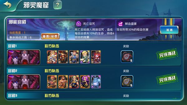 邪灵魔窟是装备注魔材料和专属装备的主要产地,共计6个小关卡+1个BOSS关卡,每关敌人都有非常强力的buff,而且由于魔窟的毒气英雄们不能战斗太久,每天每位英雄只能上阵一次,实在打不过还可以“祈祷”,通过减少,每激活一个祈祷通关奖励都会降低,殿下要仔细考虑寻找平衡点哦~