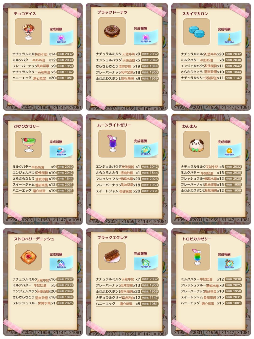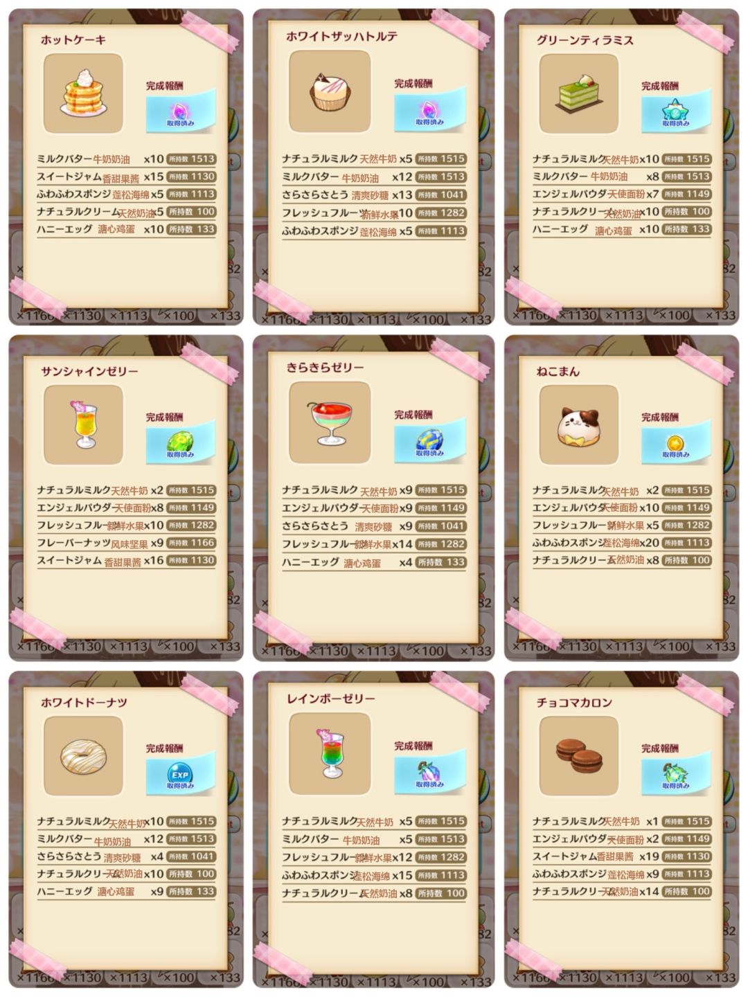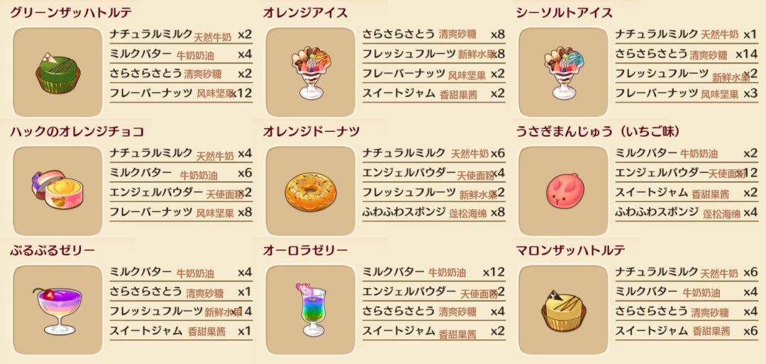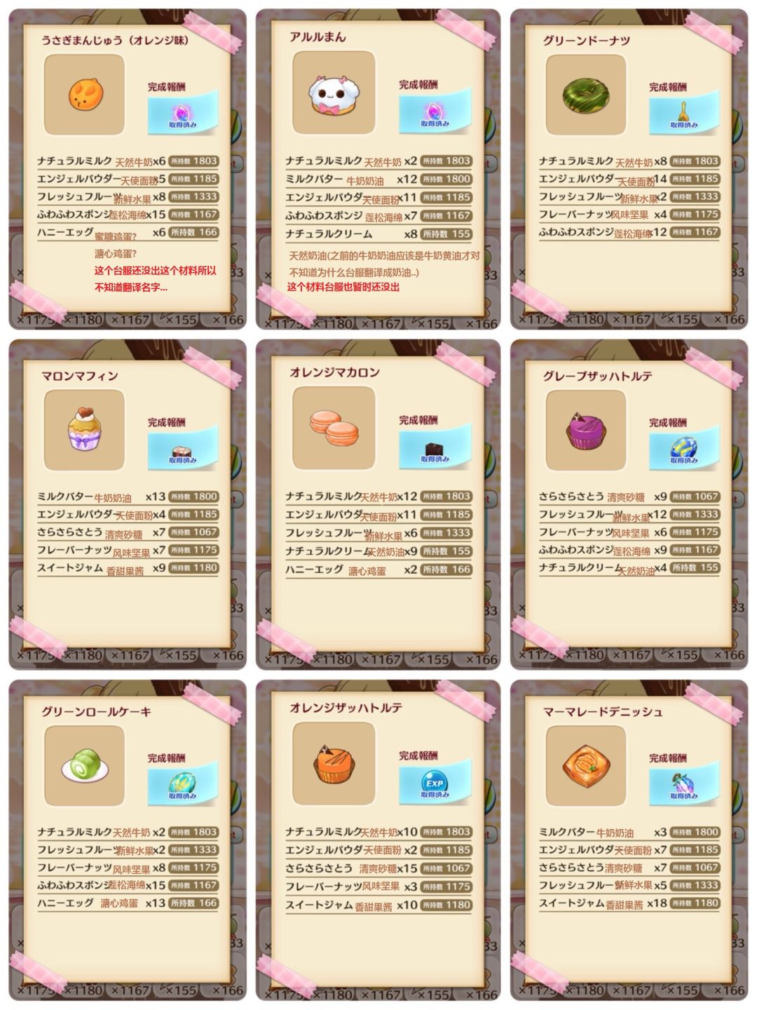 翻译是根据日服的来,到时候可能会有分别,不过起码前2页是完全相同的...另外因为有2个材料台服还没出,所以我暂时先翻译为[溏心鸡蛋]和[天然奶油],到时候台服出的时候应该会有翻译不同,到时候我在更新翻译名字吧..