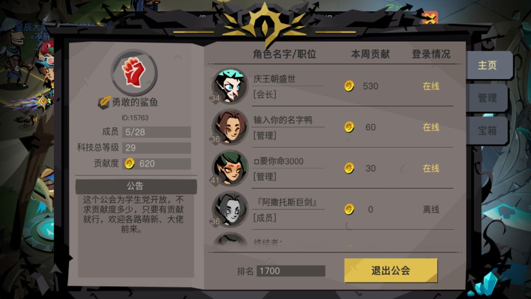 我们公会是主要是对学生党开放的,有很多的人可能因为没时间做公会任务而被踢,我们公会不求贡献,来了就是兄弟,下面附上公会三围。