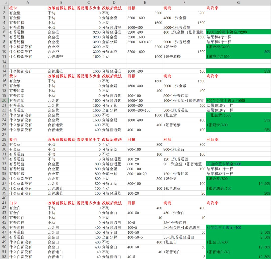 合成金色 投资=金卡造价,收益=金卡分解价+金卡/普通造价