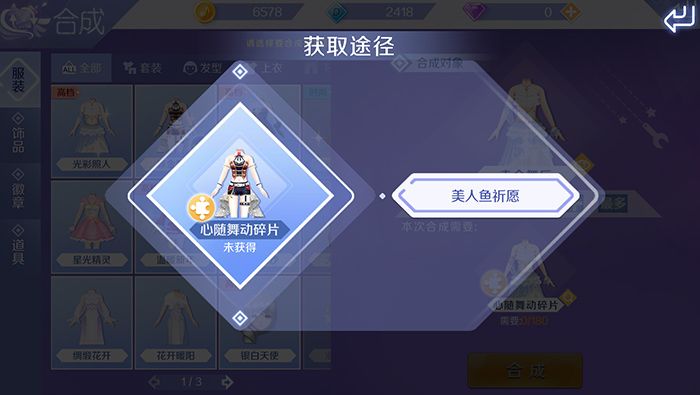 另外不同服饰合成需要的碎片都不一样,玩家点击服饰合成碎片后,可以看到服饰碎片的获取途径。比如社区的美人鱼祈愿、舞团活动、以及休闲大厅周活动,是玩家获取服饰碎片的重要途径,想要早日合成出想要的服饰,需要坚持参与这些活动,很快就可以获取这些精美的合成服饰。