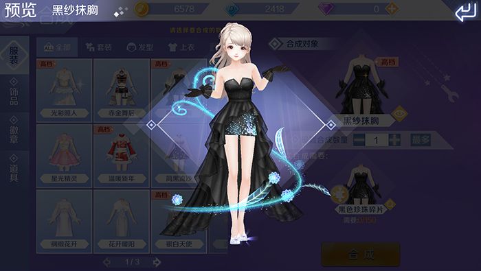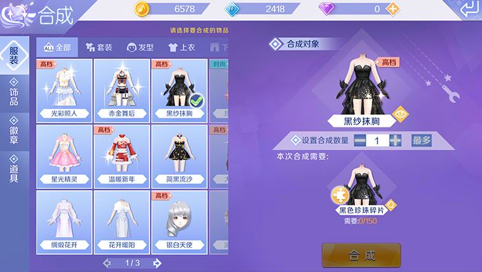 比如这里我们需要合成黑色抹胸套装,直接点击左侧的合成面板中对应服饰即可,然后右侧就会出现对应服饰的碎片数量。黑色抹胸服饰合成需要150个黑色珍珠碎片,这里玩家还可以试穿服饰、以及查看服饰合成碎片的获取途径。