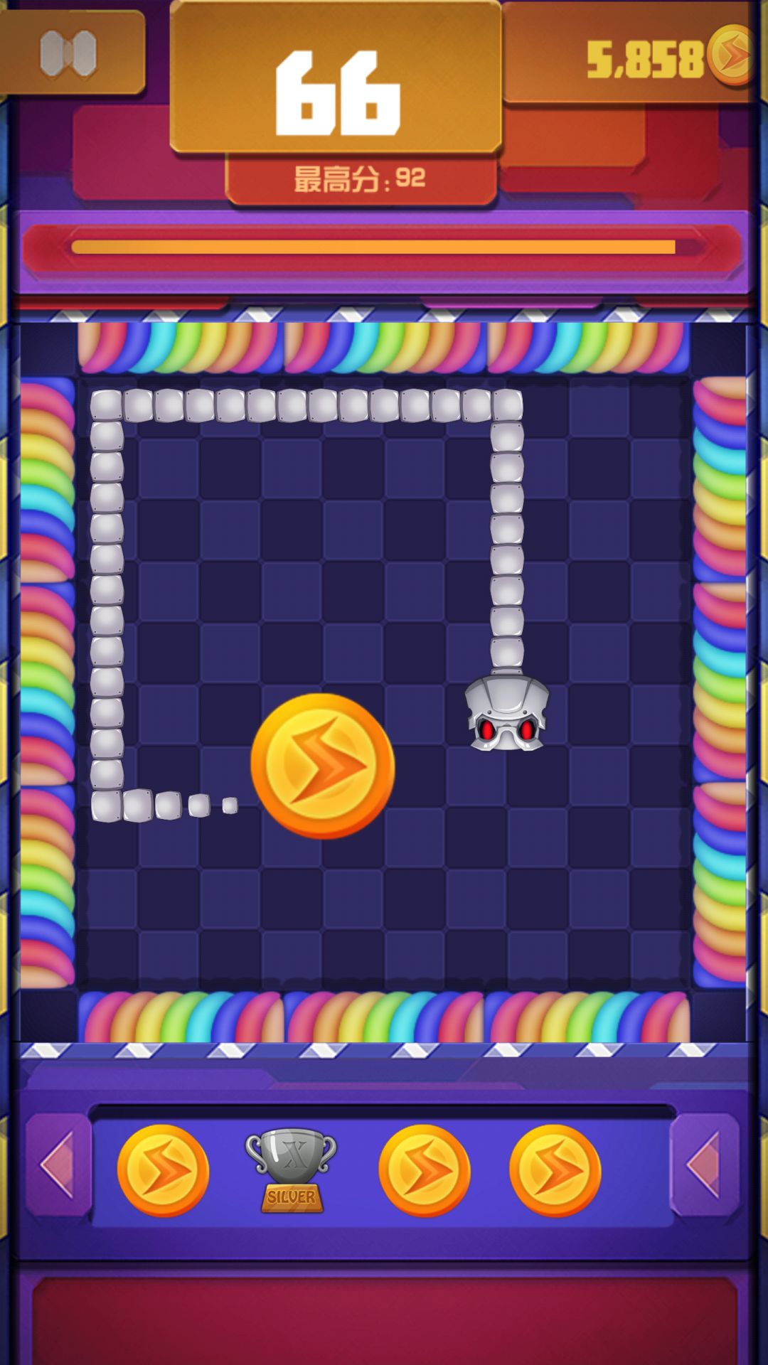 值得一提的是这次我们的贪吃蛇是有血条的,碰到自己不再是直接结束而是掉血,这样的设计在一定程度上也降低了游戏的难度,加上刚才说的丰富的道具,玩家在一局中存活的时间也变长,这样更容易获得金币解锁道具,也使游戏在只有一种模式的循环下也能让玩家不断重复游戏,不过还是希望能增加其他模式的选择,因为一轮时间很长,一直盯着屏幕也是有点累眼睛。
