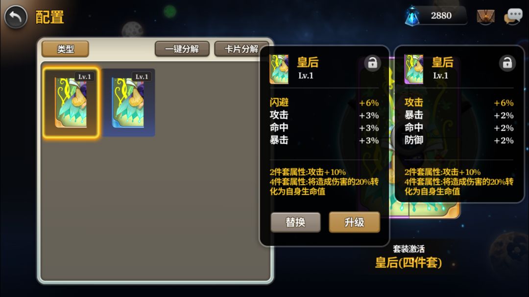 卡片栏可以看到英雄完整属性和进行命卡装备,分解,升级,现在可以锁住自己想要的命卡后一键分解(命卡上有个小锁,重要的卡锁住,很关键(脑残的白护卫经常不锁牌然后帕金森发作把它分解了🐒))。如果遇见十四十五级的倒吊人持有者,emmm…那就是远古人来着。
