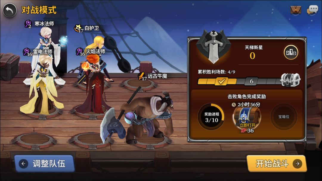 竞技模式就是天梯,也是目前几乎唯一的玩法,在这里可以调整队伍,选择上场角色(1-5人)及阵形。以及开每日的胜利宝箱和天梯宝箱(击败对面英雄10个可获得)分为木(3h),银(8h),金(12h),低等级时对手多为AI代打,高等级时会碰到真人。(远古大佬的AI能打的我这个弱者头破血流🌚)
