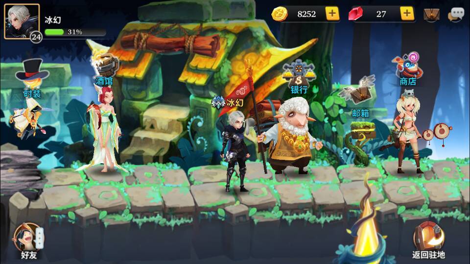 一个能见到其他玩家的功能中心,时装店可以买时装更换,银行可将钻石换成金币,商店买经验药水和买蓝白命卡分解。