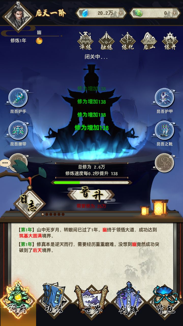 配图,这是我刚刚玩的,加入师门,师父给了两个巨灵丹,用不了,然后给我传功到了练气6。后面就是我自己玩的了,运气不错,开局第一章爆了两个中品剑