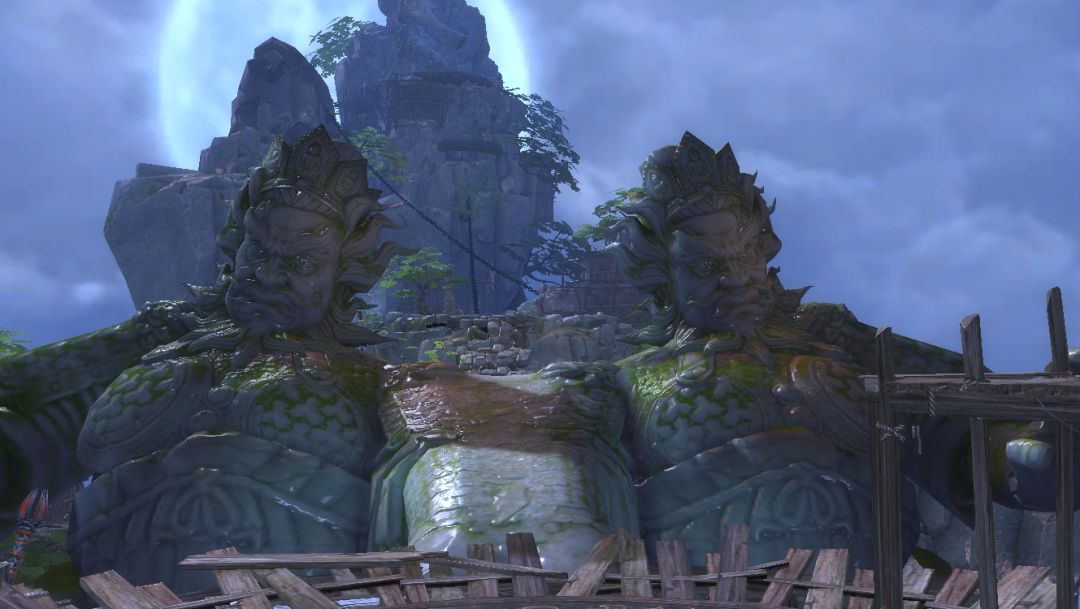 怒目神将:有两尊神像,一左一右,其背后圆圆明月被耸立高峰掩映,神像怒目圆睁,威风凛凛,俯瞰人间百态,令作乱之人闻风丧胆,落荒而逃!