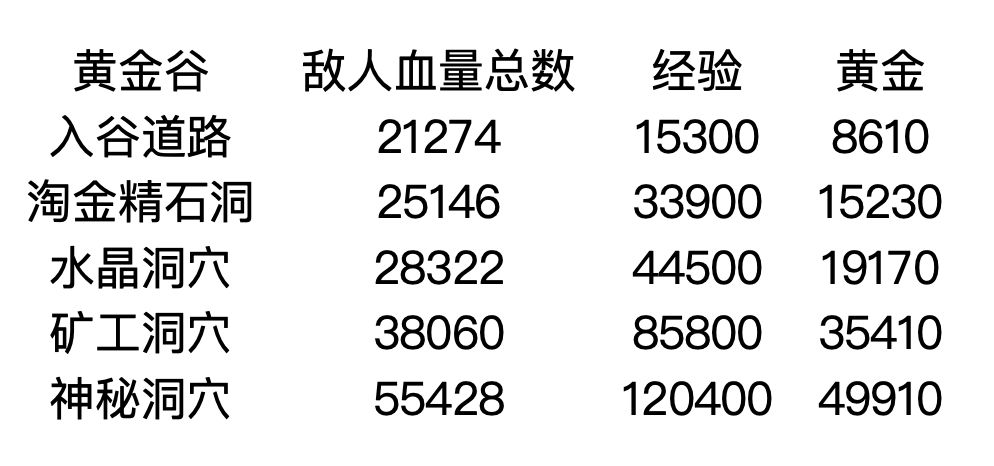 (仅适用于黄金谷和断裂森林)注:使用上面的“敌人属性”和“敌人数量”表计算。在测试中,每条路线的一般难度和困难难度在经验或黄金收益上没有区别。这意味着一般难度和困难难度会给你一样的经验和黄金。邮差骑士阶级似乎不会影响经验或黄金收益。