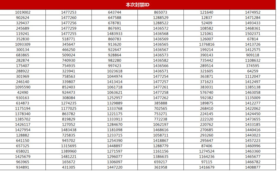 近日,我们针对用户的游戏数据进行多次分析、对用户举报的情况进行多次核实,对于使用外挂、第三方工具等行为采取封禁、删档、追究法律责任等处罚措施。下面为此次封禁账号名单: