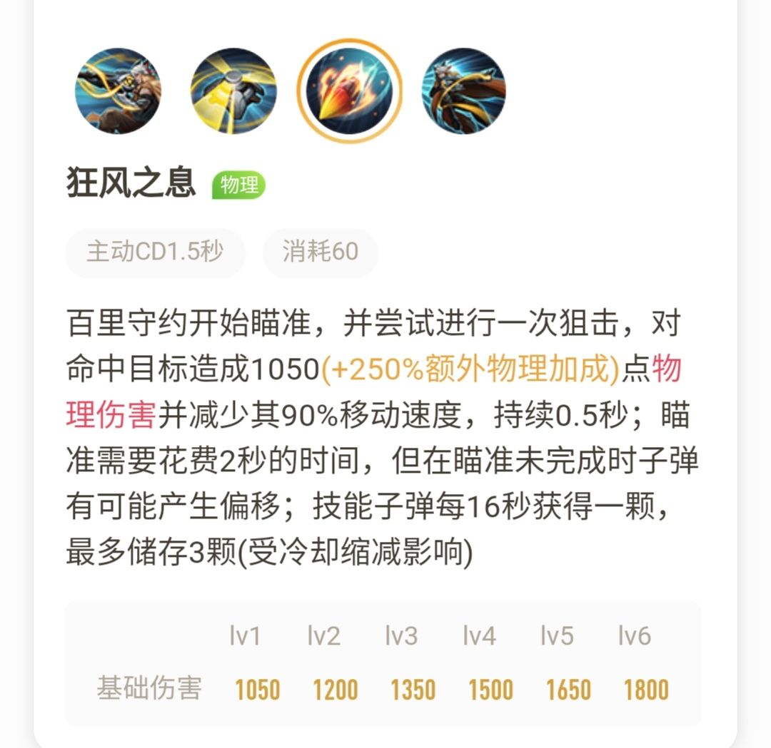 守约开始瞄准,并尝试进行一次狙击,对命中目标造成1050(+250%额外物理加成)点物理伤害并减少其90%移动速度,持续0.5秒;瞄准需要花费2秒的时间,但在瞄准未完成时子弹有可能产生偏移;技能子弹每1 6秒获得一颗,最多储存3颗(受冷却缩减影响)