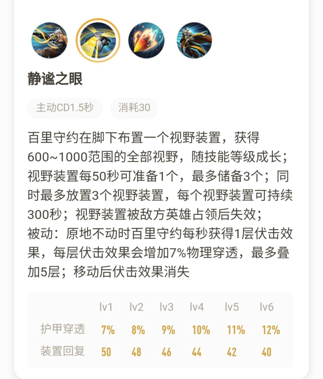 我们开始讲被动,原地不动时守约将会每秒获得一层伏击,每层增加守约(7%~12%随等级成长)的物理穿透,最多五层。移动后伏击消失。